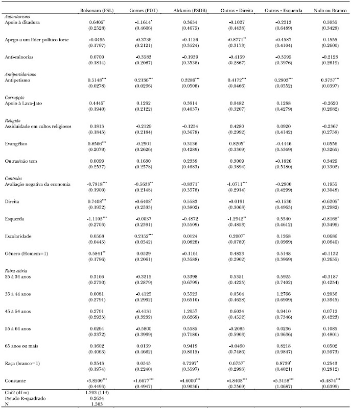 Examinamos simultaneamente cada uma das hipóteses acima com um modelo logit multinomial para o primeiro turno e logit para o segundo. Demonstramos várias descobertas interessantes. Primeiro, o apoio a ditadura: o apoio dos eleitores ao regime democrático em 2018 eram menores do que em anos anteriores e em nossas estimativas mostram que isso teve um grande efeito para o voto em Bolsonaro. Em segundo lugar, demonstramos que as percepções dos eleitores sobre o Partido dos Trabalhadores continua sendo a principal divisão partidária no país (Samuels e Zucco, 2018) e o antipetismo foi marcadamente um dos principais preditores da vitória bolsonarista. Os eleitores de Bolsonaro foram influenciados pela questão que Bolsonaro mais enfatizou: a corrupção do governo do PT. Neste caso, o apoio que os eleitores davam à Operação Lava Jato é significativo. Finalmente, demonstramos que, embora Bolsonaro possa ter sido especialmente atraente para os eleitores cristãos, são entre os evangélicos que ele mostrou ser mais atrativo. Pois se a filiação religiosa importa, no segundo turno também se mostrou claro o clamor daqueles que mais frequentam cultos religiosos no apoio ao ex-capitão.