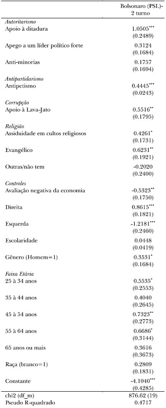 A categoria de referência para as faixas etárias foram os eleitores entre 16 e 24 anos de idade. Nas variáveis "Apego a um líder político forte" e "Anti-minorias", a categoria de referência foi aqueles discordam e discordam muito com a afirmação feita na pergunta. Para a definição do "Apoio à ditadura" foram utilizadas como categoria de referência aqueles que não responderam que em algumas situações é melhor viver em uma ditadura. A categoria de referência usada para medir a avaliação negativa da economia foram os indivíduos que consideraram que a economia melhorou ou melhorou muito nos últimos 12 meses. Para avaliação do gênero e da raça foram usados os eleitores "mulheres" e não-brancos como categorias de referência, respectivamente.