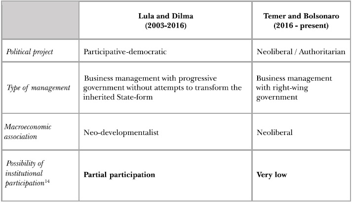 To determine whether a political context leads to more or fewer possibilities of participation, we need to consider various conditions. First, it is necessary to look at each administration's political project9 during each period under analysis (Dagnino, Olvera and Panfichi, 2006). Secondly, it is necessary to reflect upon the arguments that characterize the types of management10 in the context of Latin American governments (Bringel and Falero, 2016).
