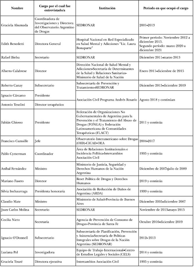 Para la realización de las entrevistas tomamos los resguardos éticos necesarios. Previo a la realización de las mismas, leímos y entregamos a cada participante un consentimiento informado en el que se explicaba brevemente el marco institucional, los objetivos de la investigación, el carácter voluntario de la participación y las condiciones de confidencialidad de los datos recogidos, y se solicitaba autorización para grabar el audio de la conversación. En virtud del estatuto de las personas entrevistadas (importantes referentes del campo de los consumos de drogas en Argentina), consideramos relevante incluir sus nombres en un cuadro que puede consultarse en el anexo del presente artículo6. Para ello, enviamos un correo electrónico a cada participante para solicitarle su consentimiento. En todos los casos, las personas entrevistadas aceptaron que su nombre fuera incluido en el trabajo.