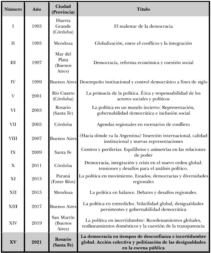 Como sucede de forma ininterrumpida cada dos años desde el primer encuentro en 1993, entre los días 10 y 13 de noviembre del año 2021 se celebró en la Universidad Nacional de Rosario (UNR) el XV Congreso Nacional de Ciencia Política. Coorganizado por la Sociedad Argentina de Análisis Político (SAAP) y la UNR, el mismo se tituló «La democracia en tiempos de desconfianza e incertidumbre global. Acción colectiva y politización de las desigualdades en la escena pública», y tuvo la particularidad de realizarse de forma conjunta con el VII Congreso Internacional de Democracia de la UNR, el cual se suspendió en el año 2020 por la pandemia.
