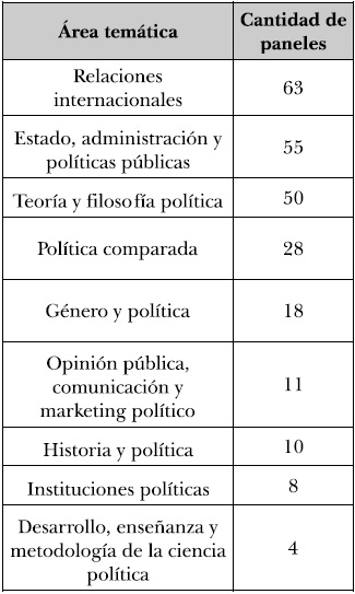 Tal como se observa en la Tabla 3, las áreas que tuvieron mayor cantidad de paneles fueron las de Relaciones Internacionales, con 63; Estado, Administración y políticas públicas, 55 secciones; y Teoría y Filosofía Política, que contó con 50 paneles participantes