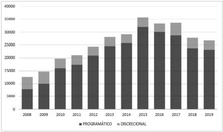 Los datos indican que el gobierno de Macri implicó una reversión en la tendencia del aumento del gasto programático y reducción del discrecional del gobierno anterior. En montos reales (año base 2008), las transferencias programáticas durante este gobierno pasaron de 30.000 millones en 2016 a 23.000 millones en 2019, disminuyendo un 23 por ciento. Por su parte, las discrecionales pasaron de 3.300 millones a 3.900 millones, aumentando un 18 por ciento en el mismo periodo. Entre 2015 (último año de CFK) y 2017, el año de mayor suba del gasto discrecional, el aumento fue de casi un 26 por ciento (Ver Gráfico 1).