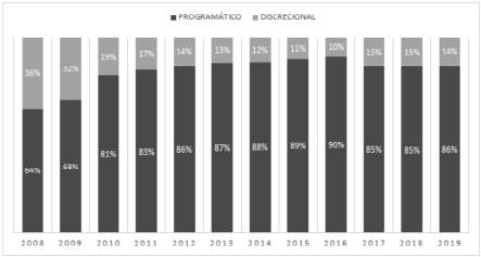 Para el presente trabajo clasificamos una población total de 364 programas del gobierno nacional entre 2008 y 2019 (aquellos que cambiaron de nombre o de ministerio se contabilizaron como un único programa)2. A partir de documentos oficiales, analizamos los objetivos y las actividades de cada uno de estos para determinar si existían transferencias que respondan a los criterios establecidos como “ayudas sociales directas y urgentes”, es decir, transferencias monetarias a personas en situaciones de vulnerabilidad. Con este criterio, seleccionamos 27 programas que cuentan con actividades de este tipo y pueden ser considerados planes sociales3. Luego los clasificamos como discrecionales o programáticos -según criterios especificados más abajo- para comparar la evolución de los porcentajes destinados a cada grupo a través del tiempo durante las dos administraciones.