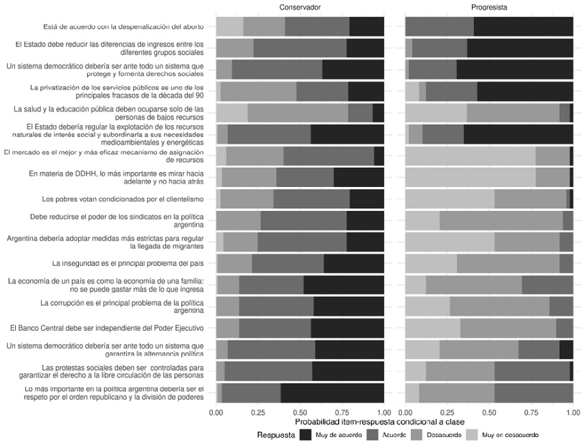 El Gráfico 1 presenta las probabilidades ítem-respuesta del modelo con dos clases: una caracterizada por respuestas progresistas; la otra, por respuestas conservadoras en lo social y cultural y pro-mercado en lo económico (en adelante, “conservadores”). La mayoría de los indicadores son muy discriminantes: cuando una de las clases tiene altas probabilidades de responder «muy de acuerdo» o «acuerdo», la otra tiene altas probabilidades de responder «desacuerdo» o «muy en desacuerdo». Los únicos indicadores en los que hay un relativo consenso remiten a la protección y el fomento de derechos sociales, la regulación estatal de los recursos naturales, y la reducción de las brechas de ingreso. Más allá de estos consensos, encontramos dos polos programáticos claramente definidos11.