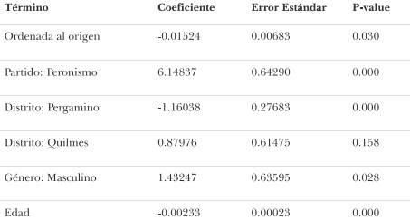 Resta saber cómo se relacionan estos polos con los partidos y distritos. En el Modelo 1, la probabilidad de pertenencia a estas clases ocupa el lugar de variable dependiente en un modelo lineal logístico binomial. Las covariadas o variables independientes de interés son el partido de pertenencia y el distrito; se agregaron como controles las variables de género, edad, religiosidad y tipo de educación recibida, que suelen identificarse como influyentes en las ideas políticas. Los resultados se resumen en la Tabla 1.