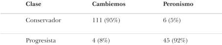 Del análisis de clases latentes puede concluirse que el personal político del PRO-Cambiemos mantiene su consistencia programática, con independencia del distrito de pertenencia, y posee alta homogeneidad en sus ideas políticas, pues el 96% de los entrevistados son asignados a la clase conservadora; a su vez, el 95% de los asignados a dicha clase pertenecen al PRO-Cambiemos.
