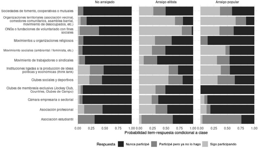Las categorías de la variable “arraigos sociales” se infirieron a partir de las probabilidades de participación en cada tipo de organización. Nos centramos en aquellas con mayor capacidad discriminante, es decir, en las que la probabilidad de participación presente o pasada diverge en mayor magnitud entre las categorías de la variable “arraigos sociales”.