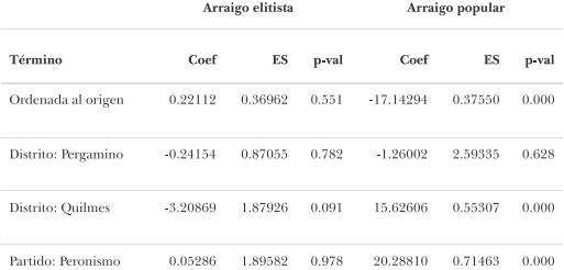 La comparación entre partidos muestra que el peronismo y sus aliados están asociados positivamente con la categoría arraigo popular. Un peronista seleccionado al azar tiene una probabilidad mucho más alta que un cuadro del PRO-Cambiemos de pertenecer a esa categoría (• =20.28). En términos de distritos, el caso distintivo es Quilmes, donde la probabilidad de pertenecer a la categoría “no arraigado” es significativamente mayor que la de un político de C.A.B.A. seleccionado al azar. Según este modelo, los elencos políticos de Pergamino -independientemente del partido de pertenencia- no son distinguibles de los de C.A.B.A., al menos en relación a sus arraigos sociales.