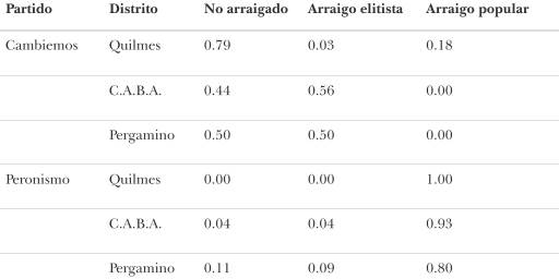 Estos datos muestran que los elencos del PRO-Cambiemos en Quilmes presentan la probabilidad más alta de no tener arraigos sociales, mientras que el arraigo elitista tiene su mayor probabilidad entre los elencos del PRO-Cambiemos de C.A.B.A. y Pergamino. En estos dos últimos distritos, el personal político partidario presenta probabilidades similares de tener un arraigo elitista o de no estar arraigado, con una probabilidad prácticamente nula de tener un arraigo popular; pero en Quilmes es alta la probabilidad de que los cuadros del partido pertenezcan a la categoría de “no arraigados”.