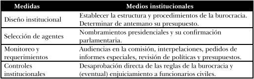 Un último aspecto a destacar es que hay consenso entre los especialistas que no existen arreglos institucionales que permitan eliminar los problemas de agencia que plantea el control parlamentario. Lo que no quita que se puedan tomar una serie de medidas para contrarrestar sus efectos, entre las cuales importa destacar: a) el desarrollo de un diseño de contrato adecuado que establezca de antemano los intereses de las partes, los incentivos, las compensaciones, las sanciones, etc.; b) un sistema universal de la evaluación de antecedentes que permita elegir agentes idóneos; c) mecanismos de monitoreo y requerimiento de información eficientes; y d) la activación de controles institucionales cuando se detectan anomalías y/o irregularidades en las agencias burocráticas (McCubbins y Kiewiet, 1991: 27-34)4.