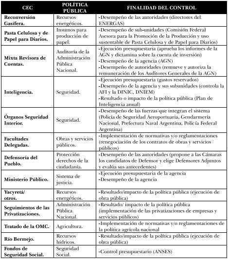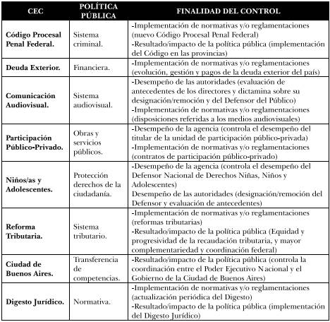 Por último, el control de resultado/impacto de la política pública se refiere a las CEC cuya ley de creación explicita esa finalidad, como sucede, por ejemplo, con la ya mencionada CEC de Implementación del Código Procesal Penal, que controla la implementación del nuevo código penal en algunas provincias del país o las CEC unicamerales de Yacyretá/otros y Río Bermejo, que controlan la ejecución de las obras públicas en las provincias.