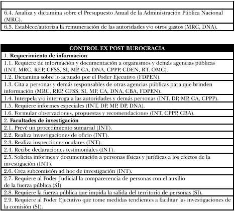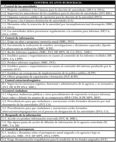 En cuanto a los controles institucionales, en ningún caso la normativa explicita las atribuciones de las CEC para vetar las reglamentaciones que se da la burocracia como sucede en el Congreso de Estados Unidos. Sí les otorga facultades para citar y/o interpelar las autoridades (control ex post).