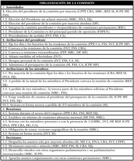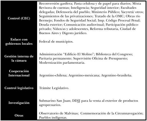 Dentro de este último grupo de CE se hallan dos de investigación15; tres de cooperación internacional concebidas para vincular el Congreso nacional con el de otros países; dos mixtas integradas por legisladores y representantes externos16; una de enlace del Congreso con los gobiernos locales; tres sobre temáticas específicas; y una de control legislativo17.