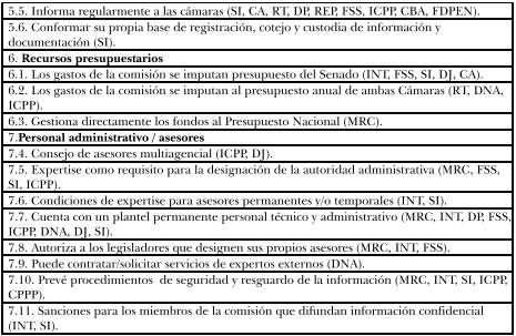 En relación al presupuesto asignado a las CEC, los reglamentos internos son poco precisos. Solo en cuatro CEC se establece que los gastos de la comisión se imputarán al presupuesto asignado al Senado, mientras que en otras dos CEC se imputan al presupuesto de las cámaras. No hay disposiciones precisas por las cuales las CEC están obligadas a publicitar agenda de reuniones y no suelen tomarse versiones taquigráficas. Incluso, en ciertas CEC los reglamentos las autorizan a sesionar en secreto.