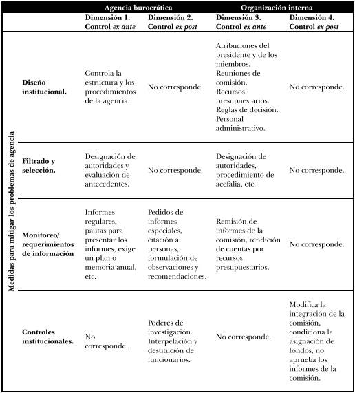 La primera dimensión de la Tabla 2 se refiere a la delegación que hace la comisión hacia las agencias burocráticas. En dicha dimensión, el control ex ante comprende procedimientos de diseño institucional, selección de autoridades y el monitoreo/requerimiento de información. Es importante aclarar que la literatura considera al monitoreo/requerimiento de información como un procedimiento de control ex post. Sin embargo, en esta investigación se los considera además un procedimiento de control ex ante, en tanto está previsto en las leyes y reglamentos internos de las CEC, y por consiguiente, los legisladores están obligados a activarlos, al menos formalmente. En otras palabras, se trata de mecanismos automáticos que se activan -así debería suceder-independientemente de la voluntad del legislador.
