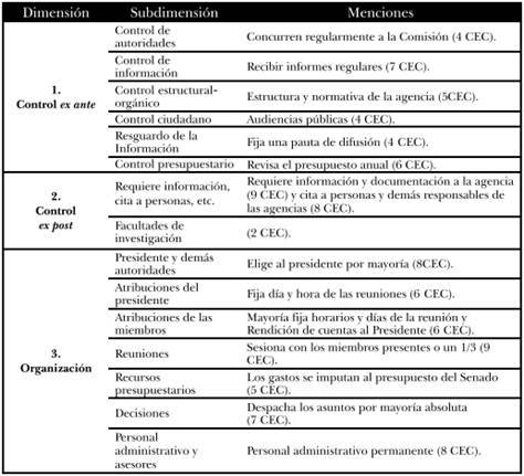 Las otras dos dimensiones de control ex ante y ex post están comprendidas en la delegación que hacen cada una de las cámaras hacia las comisiones, y como tal, da cuenta de su organización interna. Por lo tanto, dicha delegación está condicionada por el diseño institucional de la comisión por el cual se establecen las atribuciones de sus miembros, las reglas de decisión, la asignación de recursos presupuestarios, etc. También comprende la activación de procedimientos de elección y destitución de autoridades (presidente y vicepresidente de la CEC) y de monitoreo/requerimiento de información. Estos últimos implican que la CEC debe rendir cuentas a la cámara, informándola de sus actividades.