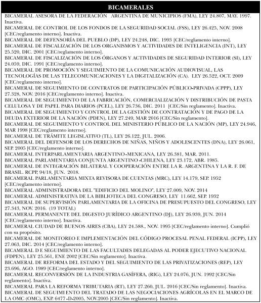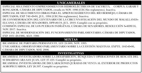 Pasando a considerar su estructura, el Congreso argentino presenta cuatro tipos de CE: las unicamerales, integradas solo por legisladores de una cámara; las bicamerales, integradas por legisladores de ambas cámaras; las mixtas (bicamerales o unicamerales), integradas tanto por legisladores, como por representantes de otros poderes o de la sociedad civil; y las de investigación (pueden ser bicamerales o unicamerales)13. Por último, existen los denominados organismos de representación parlamentaria (ORP), integrados por legisladores y representantes de otras agencias u organismos que funcionan fuera del Congreso nacional y, por lo tanto, no deben ser confundidos con las CE mixtas14.