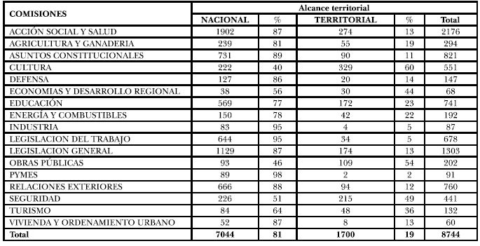 En la mayor parte de las comisiones “nacionales” se observó una proporción de proyectos territoriales menor a la total: Asuntos Constitucionales, Defensa, Legislación General, Relaciones Exteriores. En la mayor parte de las comisiones de carácter sectorial se observó una proporción de proyectos territoriales menor o igual al total: Agricultura y Ganaderia, Industria, Legislación del Trabajo y Pymes. De las dos comisiones de carácter distributivo seleccionadas, sólo en Obras Públicas se observa un alto porcentaje de proyectos territoriales, algo que no sucede en Vivienda y Ordenamiento Urbano.