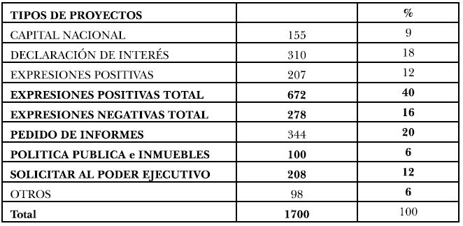 De manera esquemática, podríamos decir que una parte de los proyectos territoriales estudiados -un 40%- corresponden a expresiones “positivas” relativas al territorio representado -reconocimiento de personajes relevantes locales, beneplácito por eventos locales, políticas públicas provinciales o municipales-. Algunas de estas expresiones positivas respecto al territorio se presentan en forma de “declaraciones de interés”, así como de pedidos de establecimiento de la capital, la fiesta, el día “de” o de declaraciones de “monumento” o “poblado histórico” nacional (categorizados en el cuadro como “capital nacional”).