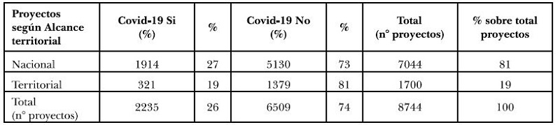 Como último dato, tenemos en cuenta las particularidades del período analizado, en que se desplegaron las consecuencias de la pandemia del COVID-19 y las políticas implementadas para contener no sólo sus consecuencias sanitarias, sino también sus efectos sociales y económicos7; los que impactaron de manera heterogénea a lo largo del territorio. En este contexto, consideramos relevante identificar la proporción de proyectos territoriales vinculados al covid 19.