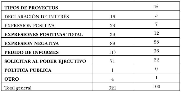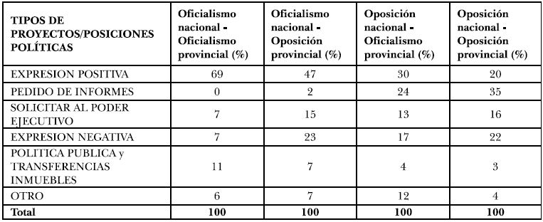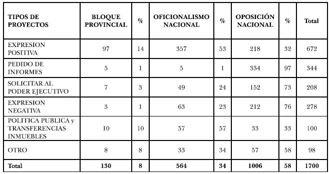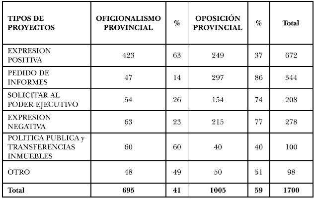 Es importante consignar que los opositores tampoco se privan de presentar proyectos que suponen “expresiones positivas”, los cuales, como habíamos señalado también, incluyen los prototípicos proyectos territoriales y las declaraciones de interés. En una situación desventajosa en términos de acceso a los ejecutivos, también echan mano de estos recursos simbólicos para enviar señales a sus bases territoriales, tal como ya señaló la literatura especializada.