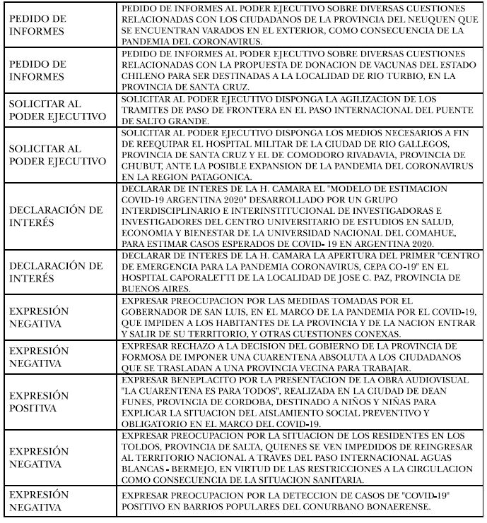 El período de la pandemia nos ha permitido ilustrar la propuesta de clasificación de los proyectos territoriales, al proporcionarnos una misma problemática en torno a la cual se expresaron los legisladores.