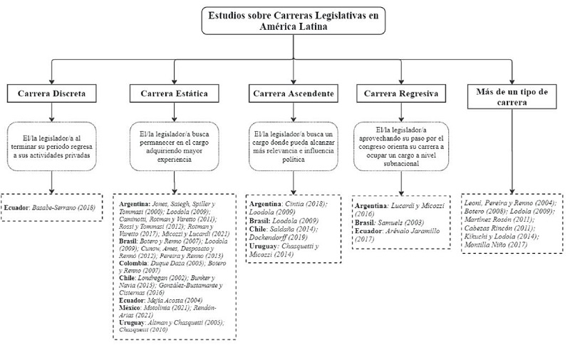 Esta investigación se centra en analizar los factores que influyen en las carreras políticas de congresistas, con un enfoque particular en las trayectorias regresivas, sin descuidar las estáticas, ascendentes y discretas. Antes de explorar estos factores, es crucial examinar la literatura previa sobre carreras políticas legislativas en América Latina. Se debe reconocer que las ambiciones políticas abarcan una variedad de caminos, más allá del tradicional ascenso a cargos nacionales. Desde esta perspectiva, la ambición política y el tipo de carrera política a seguir se adapta estratégicamente a las oportunidades disponibles en el entorno político, y las posibilidades de un actor político para postularse a un cargo se ven influenciadas por la situación política circundante (Hibbing, 1999; Rohde, 1979; Black, 1972). El Gráfico 1 resume la investigación previa sobre las carreras políticas de legisladores en la región.