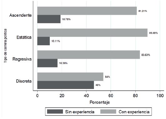 Hipótesis 2: legisladores/as con experiencia política previa presentan más probabilidad de desarrollar carreras ascendentes, estáticas y regresivas, pero dicha experiencia genera un efecto negativo en la probabilidad de desarrollar una carrera discreta.