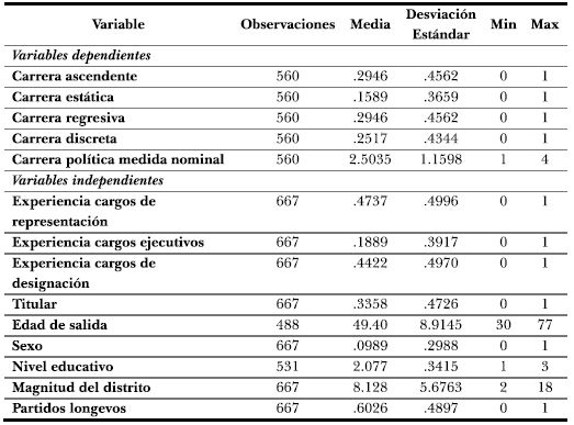 En cuanto a las variables de control4, se estima el efecto que puede tener la edad sobre la definición de la carrera política. La edad de las y los legisladores al abandonar la legislatura se recopiló y se codificó de forma continua. Para evaluar la influencia del género de la persona, se creó una variable dicotómica, donde (0) representa a los hombres y (1) a las mujeres. Asimismo, se registró de manera dicotómica la titularidad; si el o la legisladora fue reelegida al menos una vez, la variable adopta el valor de (1), y en caso contrario, (0).