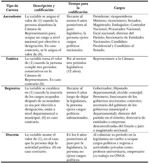 Se debe resaltar que la presente investigación divide el análisis de las carreras legislativas o variable dependiente en cuatro tipos: ascendente, regresiva, estática y discreta (Schlesinger, 1966; Samuels, 2003). Es importante considerar un periodo de tiempo amplio, porque se estima que la carrera no se define por el cargo que ocupa el legislador inmediatamente después de dejar la legislatura; sino que, por el contrario, esta se va precisando con el paso de los años en razón a sus aspiraciones y a las oportunidades o restricciones del entorno (Hibbing, 1999). Es por esto que en la presente investigación se rastrea la carrera posterior del legislador por el periodo de tiempo considerado en la Tabla 1, donde se puede observar la codificación que se siguió para cada tipo de carrera política3.