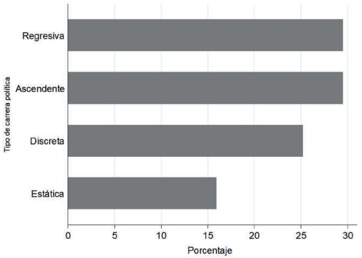 No obstante, un tema que la literatura parece pasar por alto es lo que ocurre con las y los legisladores que optan por no competir por cargos y prefieren retirarse de la vida política. Esta pauta en la trayectoria legislativa se denomina “carrera discreta” (Schlesinger, 1966: 93), y los estudios en esta área son escasos. Montilla Niño (2017) aborda parcialmente este aspecto en su estudio comparativo en Colombia, Uruguay y Chile. La autora demuestra que congresistas que eligen esta forma de ambición no superan el 20% en los tres países. Además, señala que, en Colombia y Uruguay, son principalmente las y los legisladores de las cámaras bajas quienes optan mayoritariamente por una carrera discreta, mientras que en Chile la tendencia se invierte, siendo más común en el Senado. Basabe-Serrano (2018), en su análisis para Ecuador, sostiene que aquellas personas que siguen estas trayectorias suelen carecer de experiencias políticas anteriores y tienden a tener una participación pasiva en la legislatura.