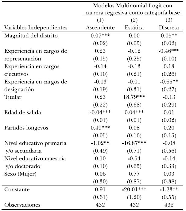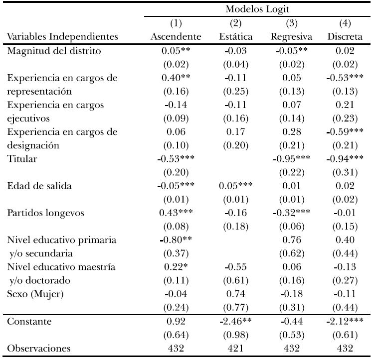 Los resultados de los modelos logit presentados en la Tabla 2 y los multinomial logit en la Tabla 3, proporcionando información sobre los factores que influyen en las diferentes trayectorias de carrera política de las y los legisladores.