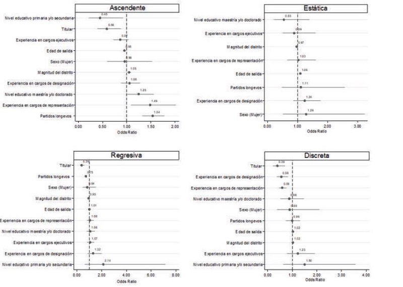 Esta investigación se enfoca en analizar los factores que explican los diferentes tipos de carreras políticas que surgen después de ejercer un cargo de representación en el Congreso. Dado el carácter de la variable dependiente, se aplicaron modelos de elección discreta (logit y multinomial logit). Primero se construyeron cuatro especificaciones distintas, variando la variable dependiente dicotómica para cada tipo de carrera, con el objetivo de identificar los factores que influyen positiva o negativamente en la probabilidad de que un legislador o legisladora proyecte una carrera política de tipo regresiva, estática, discreta o ascendente.