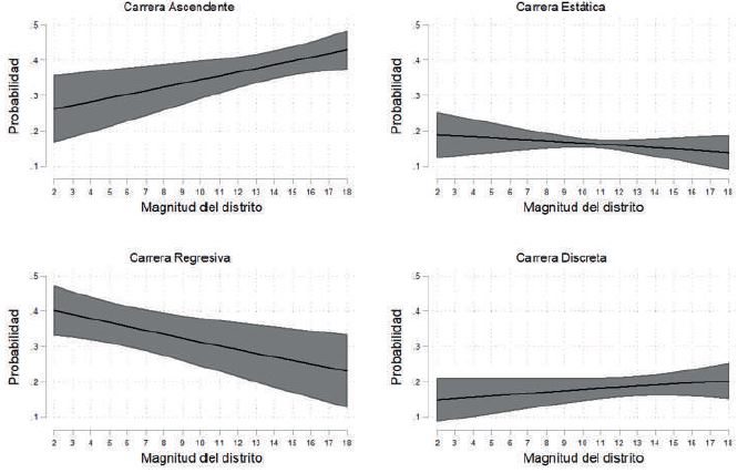 Hipótesis 1: a medida que la magnitud del distrito aumenta, es mayor la probabilidad de que legisladoras/es presenten una carrera política ascendente, estática y/o discreta, pero disminuye la probabilidad de seguir una carrera regresiva.