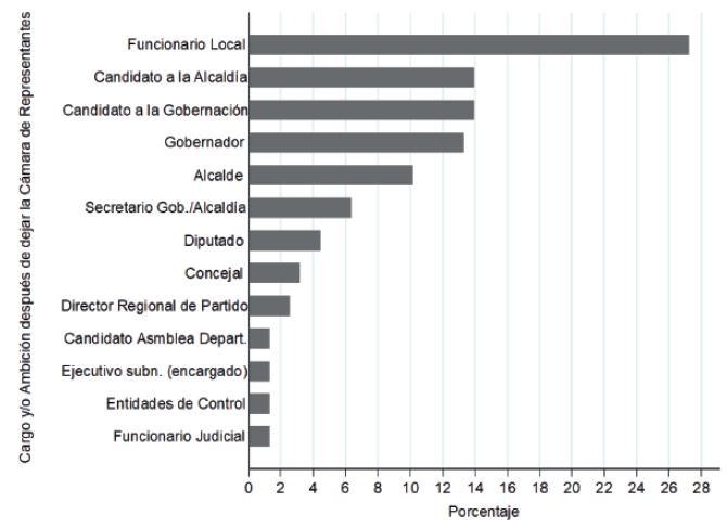 Este escenario es en parte resultado de la Constitución de 1991, que fortaleció la descentralización política en Colombia y contribuyó al debilitamiento de los partidos tradicionales (liberal y conservador) (Falleti, 2010; Montilla Niño, 2017). La transformación del sistema político de un bipartidismo superficial a un multipartidismo fragmentado abrió la puerta a la formación de nuevos partidos y la emergencia de nuevos líderes políticos. En este contexto, los congresistas de distritos pequeños tienden a capitalizar su imagen a nivel nacional durante su mandato en el legislativo para mejorar su visibilidad en lo local. Esto, a su vez, les brinda una ventaja al regresar a cargos en el gobierno subnacional con la finalidad de generar vínculos clientelares que les permita aumentar tanto sus recursos financieros como políticos (Oliveros, 2021).