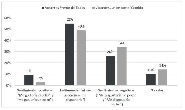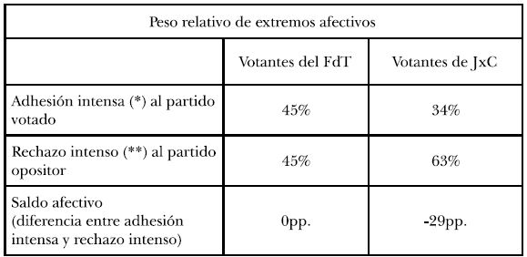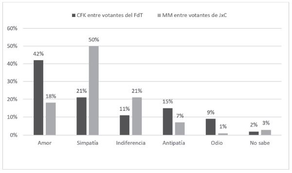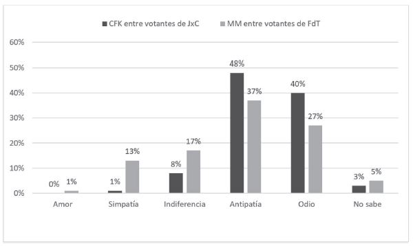 En otras palabras, entre los votantes de Juntos por el Cambio, los componentes afectivos clásicos del partidismo negativo pesarían más que entre los votantes del Frente de Todos. En caso de confirmarse tal hipótesis, se manifestaría en la sociedad argentina una asimetría afectiva equivalente a la que Mariano Torcal (2023) observa en España cuando compara las estructuras afectivas del electorado de derecha y el de izquierda. Una convergencia en este sentido iluminará un desafío explicativo que excede a nuestro estudio: ¿por qué las derechas contemporáneas contienen, o incuban, mayores niveles de partidismo negativo y de “pasiones tristes”?