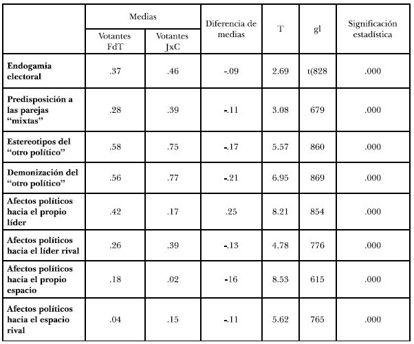 Repasados los resultados de las variables utilizadas para observar diferentes dimensiones de la polarización afectiva, nos gustaría volver sobre uno de los interrogantes centrales que motiva este trabajo: ¿la polarización afectiva que “une y separa” a votantes del FdT y de JxC es simétrica? ¿Se rechazan con la misma intensidad? En todas las variables, pudimos registrar marcadas diferencias en las actitudes, opiniones y representaciones de los dos sub-universos políticos estudiados. A continuación nos proponemos examinar si los contrastes porcentuales observados interpretados como signos de asimetrías reiteradamente señaladas- son estadísticamente significativos o no. Para evaluar este tema con mayor robustez, realizamos una comparación de la incidencia media de las variables analizadas en ambos grupos de votantes aplicando un t-test bilateral. Este tipo de prueba estadística es particularmente útil cuando se busca determinar si la eventual diferencia que pudiera hallarse entre ambos grupos resulta estadísticamente significativa, en este caso, para un nivel de significación establecido en 0.05 y un intervalo de confianza de 95%.