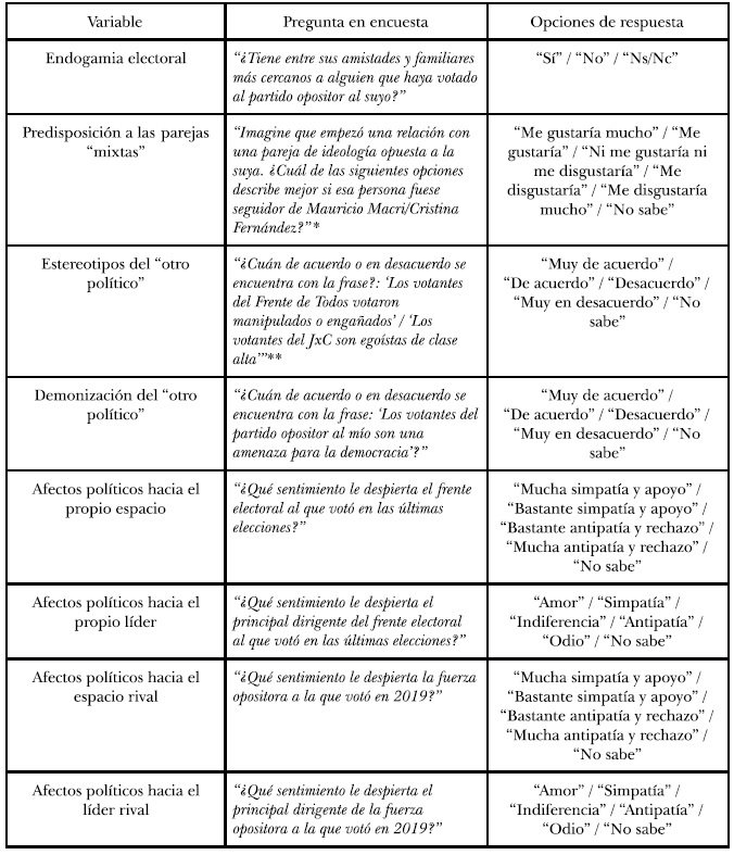 En la siguiente tabla presentamos las variables a través de las cuales vamos a observar diferentes dimensiones de la polarización afectiva: