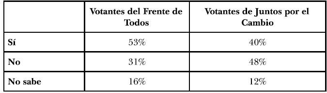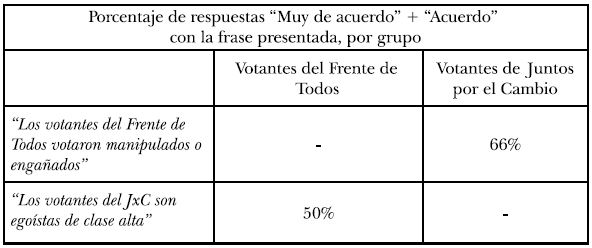 Al presentarles afirmaciones estereotipadas y negativas a unos y otros, comprobamos que en ambas megaidentidades partidarias existe una amplia adhesión a tales visiones. Más de la mitad de los electores de ambos grupos se mostraron de acuerdo con la frase que se les ofreció. Sin embargo, volvemos a encontrarnos con un desnivel: es en JxC donde la noción negativa es más extendida. Dos de cada tres de sus votantes consideraron a los partidarios del FdT como un conjunto de personas engañadas y manipuladas, es decir, ciudadanos despojados o sustraídos de cualquier tipo de racionalidad política.