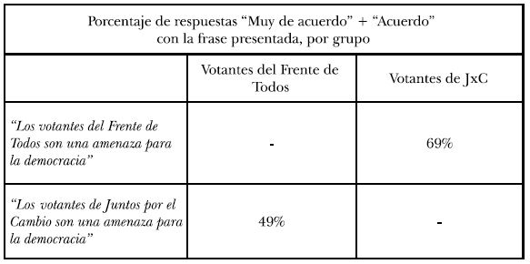 Veamos ahora los niveles de demonización del “otro político”. En un contexto democrático, la percepción del otro como amenaza a un sistema de convivencia, de reglas de competencia y de garantía de derechos fundamentales supone una hostilidad afectiva tal que condiciona el debate público, las posibilidades de convivencia y de reconocimiento dentro de una misma comunidad nacional. Acaso como forma extrema de la hostilidad afectiva, analizaremos las respuestas de ambos grupos sobre si el out group constituye una amenaza para la democracia.