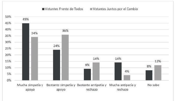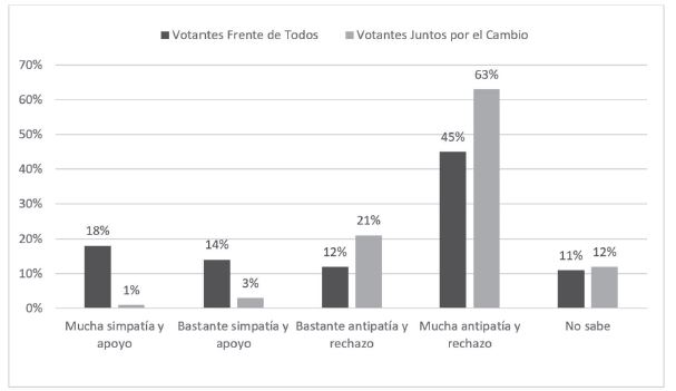 Con respecto a la evidencia acumulada hasta aquí, relativa al carácter asimétrico de la polarización argentina, es posible afirmar que los votantes de Juntos por el Cambio (vis a vis FdT) manifiestan en mayor magnitud este rasgo muy propio del partidismo negativo, por el cual el rechazo al otro desempeñaría una función central en su cohesión identitaria.