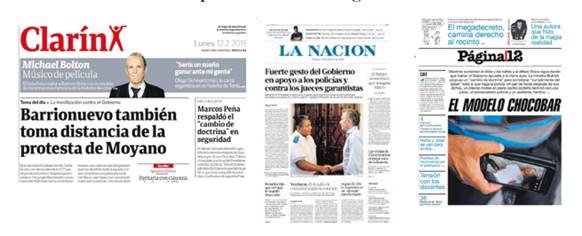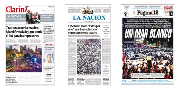 Respecto al primer caso, 2x1, y en relación a la agenda mediática, se destacan estas tres tapas de los diarios mencionados: