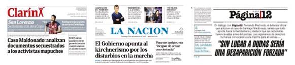 En este caso, tanto Clarín como La Nación apuntan a implicancias políticas que van más allá del caso estrictamente. De allí la idea de buscar un enemigo interno, los mapuches y el kirchnerismo, que sean los responsables de las acciones y hechos que suceden en los días posteriores a la desaparición de Santiago Maldonado. De este modo se corre el eje sobre el hecho, se busca deslegitimar la idea de una desaparición forzada -concepto expuesto desde lo sectores asociados al discurso hegemónico, como bien muestra la tapa de Página 12- a partir de la existencia otros intereses políticos de sectores de la oposición que buscan un rédito político por encima de aclarar los hechos de la desaparición y muerte y el pedido de justicia.
