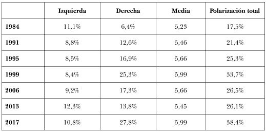 Diferentes estudios (Schulaquier y Vommaro, 2020) han destacado la relevante presencia de la polarización política en nuestro país. Esto ocurre de modo tal que las acciones que llevan adelante los diferentes actores políticos, sociales y mediáticos quedan inmersos en la lógica que la polarización presenta. El trabajo de Kessler y Vommaro (2021) a partir de los datos obtenidos en encuestas de opinión del World Values Survey realizadas en Argentina en siete ocasiones entre los años 1984 y 2017 nos brindan información respecto al modo en que distintos sectores de la sociedad argentina se posicionan en relación con diferentes temas como: economía, distribución, política, cultura, moral, etc. A modo de explicitar el nivel de polarización existente, el trabajo ya mencionado nos posibilita ver el modo en que se autoposiciona gran parte de la ciudadanía a partir de los ejes derecha e izquierda y cómo esta situación ha ido en aumento al calor de sectores ideológicamente definidos en cada uno de estos dos polos. Como bien manifiestan los autores, esto implica una novedad para la sociedad argentina6. La siguiente tabla se muestra como indicador de esto: