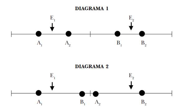 En los diagramas se muestra una situación con dos partidos políticos (A y B) que a su vez presentan dos candidatos cada uno (los puntos negros nombrados como A1, A2, B1 y B2) que se ubican en un continuo ideológico de izquierda a derecha. A su vez se representan también dos electores con sus respectivas posiciones ideológicas (las flechas nombradas como E1 y E2). En el diagrama 1, la situación muestra que los candidatos del partido A se ubican ambos en la izquierda del espectro con poca distancia entre ellos, del mismo modo que los candidatos del partido B se ubican en la derecha. A su vez los electores están posicionados en ambos casos en una posición intermedia entre los dos candidatos del partido más próximo ideológicamente. La situación representada puede interpretarse como un sistema de partidos coherentes ideológicamente o, indistintamente, como un sistema donde los electores tienden a ser leales a los partidos. En tal situación el comportamiento electoral previsible (suponiendo que los electores prefieren las opciones más próximas ideológicamente) es idéntico en un sistema con primarias separadas que con DVS. El elector E1 votaría por A1 que es el candidato más próximo ideológicamente, del mismo modo que el elector E2 votaría por el candidato B2. Pero si en cualquiera de los partidos resultara electo el otro candidato (A2 o B1), los electores volverían a votar por el mismo partido en la elección general entre los dos ganadores de la interna, ya que en ausencia de su candidato más próximo, el otro candidato del mismo partido pasa a ser el más próximo. Por lo tanto, en dicha situación el uso del DVS genera las mismas consecuencias que las primarias separadas.