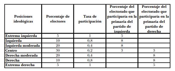 El razonamiento anterior puede visualizarse con claridad a través de un ejemplo. En la siguiente tabla se representa la distribución ideológica de un electorado “normal”13. Se trata de un ejemplo arbitrario pero realista. La gran mayoría del electorado se concentra en posiciones de centro y moderadas, mientras que una minoría se ubica en posiciones extremas (segunda columna). A su vez, se asume que los electores son tanto más participativos cuanto más radicales, por lo que se establece una tasa de participación mínima para los electores de centro que crece hacia los extremos (tercera columna). Por razones de simplicidad suponemos que existen solamente dos partidos, uno de izquierda y otro de derecha y los electores votarán en la elección primaria del partido correspondiente de acuerdo a la tasa de participación establecida (cuarta y quinta columna)14.