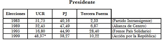 En la oposición al peronismo encontramos en los últimos años fuerzas políticas que deben lidiar con dos serios problemas para poder ser auténticas alternativas electorales y de gobierno. En primer lugar, deben superar las marcadas diferencias que existen entre ellas y sus posibles aliados y la amenaza que para sus precarias identidades representa la formación de coaliciones con ellos. Y en segundo lugar, dado que muy difícilmente logran superar esos escollos y formar una amplia coalición (lo logró el Frepaso en 1997, pero no pudo evitar pagar altísimos costos en términos de identidad por el mal desempeño de la Alianza), estas fuerzas sufren agravado el problema que ya padecía el radicalismo: sus avances electorales se reflejan sólo parcialmente en términos de poder institucional, lo que significa que no pesan en las decisiones como en la opinión. Nuevamente el Frepaso es un claro ejemplo de esto: de la comparación de los cuadros 2 y 3 puede concluirse que las terceras fuerzas (y fue el caso en particular del Frepaso, que se asentaba en los distritos más densamente poblados, es decir los más subrrepresentados) sufren en mayor medida que la UCR el desajuste entre apoyo electoral y representación institucional. Es así que en 1995, tras haber alcanzado el 20,7% de los votos para diputados a nivel nacional, el Frepaso reunía poco más del 8% de las bancas de la cámara baja. En 1997, con el 45% de los votos en conjunto con los radicales apenas si logró mejorar su posición hasta el 13% de la cámara y esta situación no varió mucho dos años después cuando la Alianza volvió a triunfar (con el 41% de los votos para diputados). Una situación similar enfrentó Acción para la República, una fuerza de centroderecha orientada por Domingo Cavallo, en 1999.