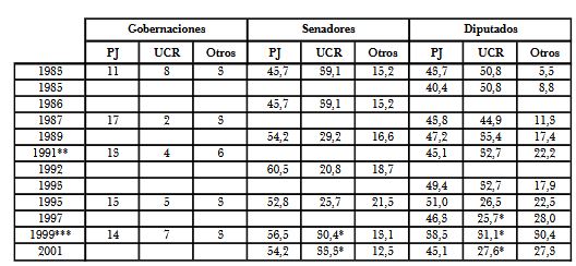 En términos electorales se observa, desde 1983, un progresivo declive de la UCR, que de fuerza mayoritaria en esos primeros comicios y en los de renovación parlamentaria de 1985, pasó a ser una segunda fuerza crecientemente debilitada, hasta que en 1995 perdió incluso esa posición. Dicha tendencia fue simultánea a un progresivo fortalecimiento del peronismo, desde la derrota electoral a manos de Alfonsín en 1983 hasta la victoria en la mayor parte de las elecciones de gobernadores y de legisladores provinciales y nacionales realizadas en 1987, lo que lo colocó en la posición de sólida y amplia primera minoría, que conservó durante los siguientes diez años, incluso reforzándola en 1995, cuando alcanzó por primera vez mayoría propia en ambas cámaras del Congreso, situación que llegó a interpretarse como indicio de la configuración de un sistema de partido predominante (véanse cuadros 1 y 2). Este cambio fue simultáneo a un progresivo debilitamiento de la polarización entre estas dos fuerzas nacionales y el consecuente reemplazo del esquema bipartidista de los primeros años por una competencia crecientemente plural que, a su vez, se puede desdoblar en dos planos diferentes: por un lado, se han ido fortaleciendo los terceros partidos nacionales, proceso que se consolidó desde 1995, cuando un frente de centroizquierda conformado por varias fuerzas menores pudo desplazar a la UCR del rol de principal oposición; por otro lado, las fuerzas provinciales se fortalecieron en la segunda mitad de los años ochenta y principios de los noventa, aunque volvieron a decaer desde entonces. Esta tendencia hacia el multipartidismo fue, en algún sentido, “compensada” por la conformación de una alianza de fuerzas opositoras al peronismo, en 1997, que reunió a la UCR con ese frente y varios partidos locales. La Alianza resultó victoriosa en la elección de renovación parlamentaria de ese año y en las presidenciales de dos años después dio lugar a una competencia bipolar que en parte reeditó el “bipartidismo” de los primeros años. Sin embargo, esta bipolaridad no sobrevivió al colapso del gobierno encabezado por De la Rúa, anticipado en los comicios de renovación parlamentaria de octubre de 2001.