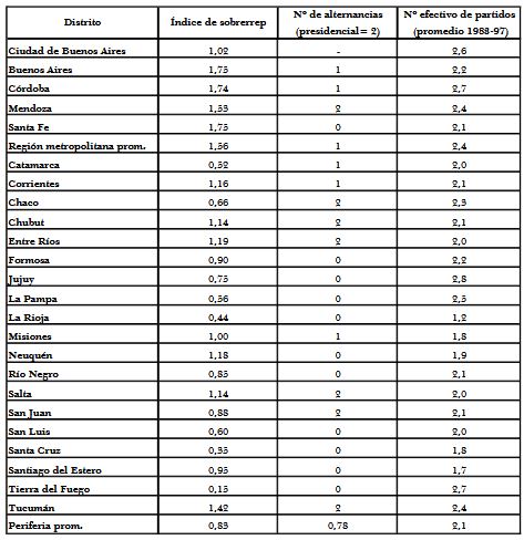 En él advertimos que los distritos que se han comportado más lealmente son los periféricos, entre los cuales se cuentan los más pequeños, en los que la sobrerrepresentación es más marcada. En resumidas cuentas el cuadro nos muestra la convergencia de sobrerrepresentación de distritos chicos y periféricos frente a los distritos grandes o “metropolitanos” y la estabilidad electoral relativa, o el menor grado de competencia y alternancia en esos distritos (producto de la combinación de sistemas electorales mayoritarios o escasamente proporcionales para las legislaturas provinciales y el bajo promedio de “número efectivo de partidos”).